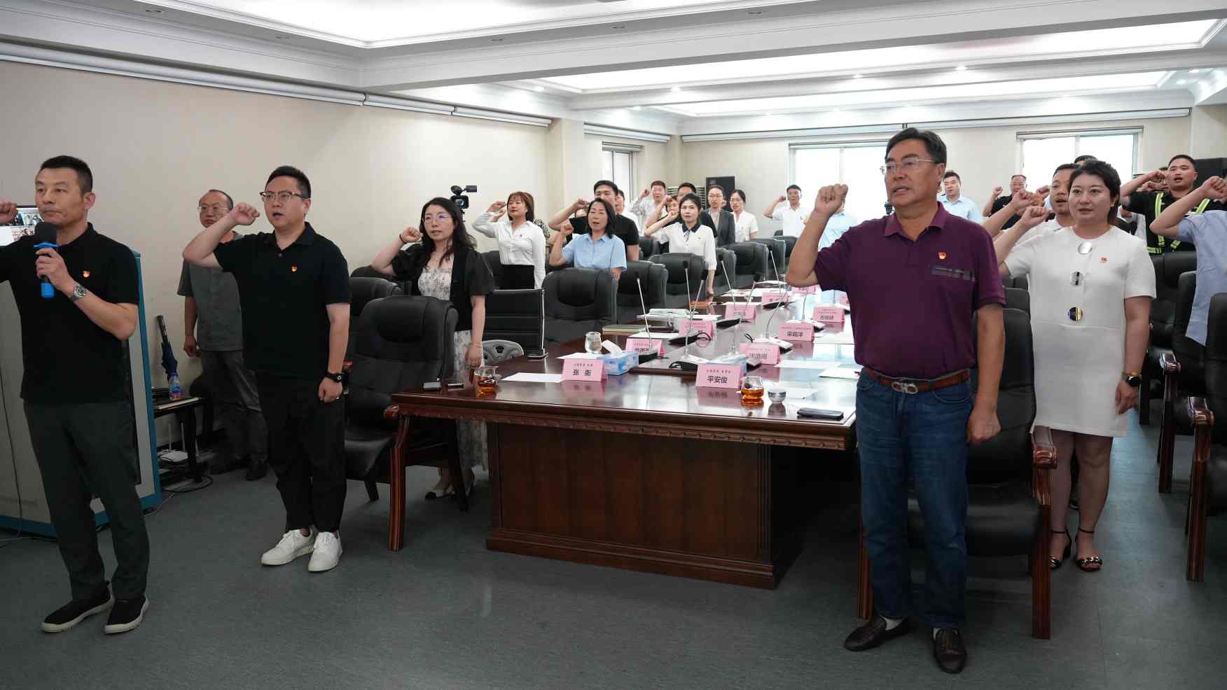 活动在国歌声中拉开序幕,现场全员起立,奏唱国歌。接下来,全体参会人员肃穆站立,举起右拳庄严宣誓,重温入党誓词。