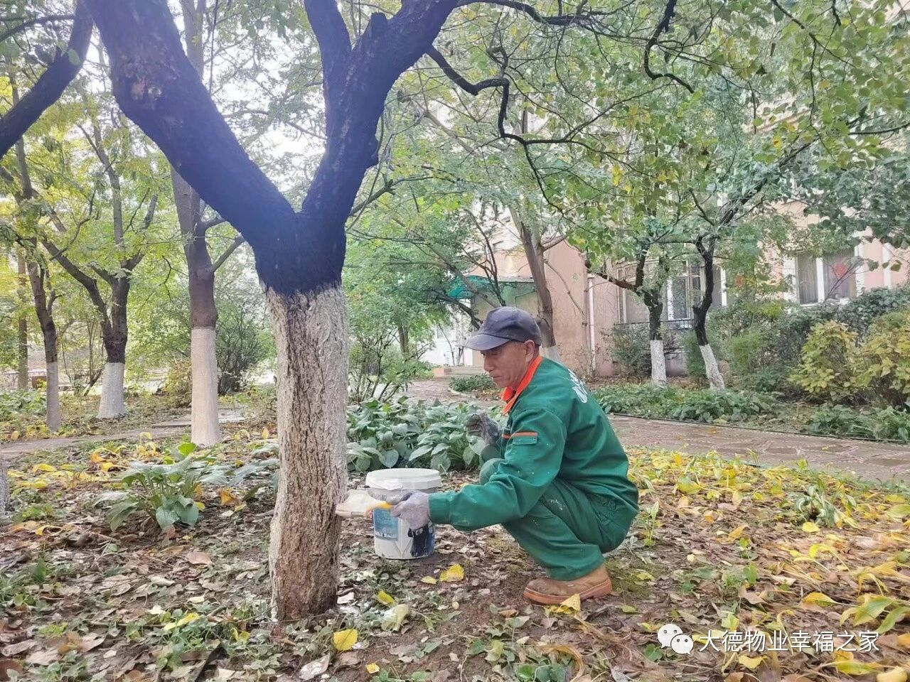 深秋温度骤降,人人都穿上了厚衣服,植物与人一样,都有冷暖感知,大德物业各项目服务中心在秋冬交替之际,结合植物生长特性,对其进行了冬季养护,为树木进行涂白,钉防寒布,使苗木健壮生长。